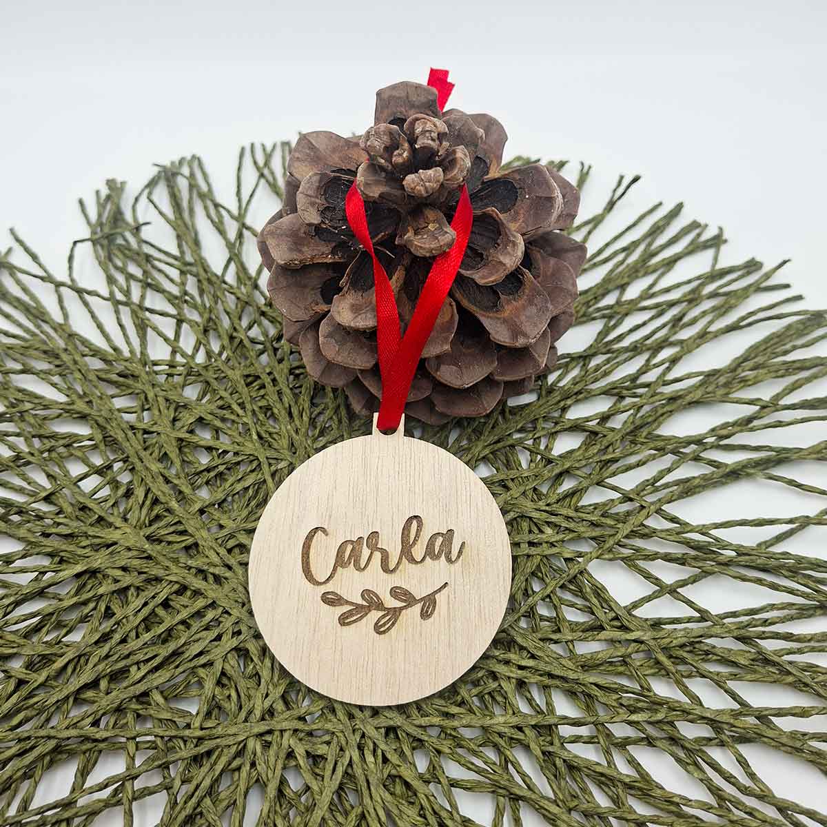 Adorna el árbol de Navidad con esta bola de madera con el nombre grabado.