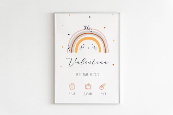 Lámina de nacimiento «Arcoiris» perfecta para enmarcar y regalar y tener un recuerdo bonito para siempre, con los datos más importantes del nacimiento del bebé. Puedes elegir la lámina digital, impresa A4, impresa A4 con marco o impresa A3.