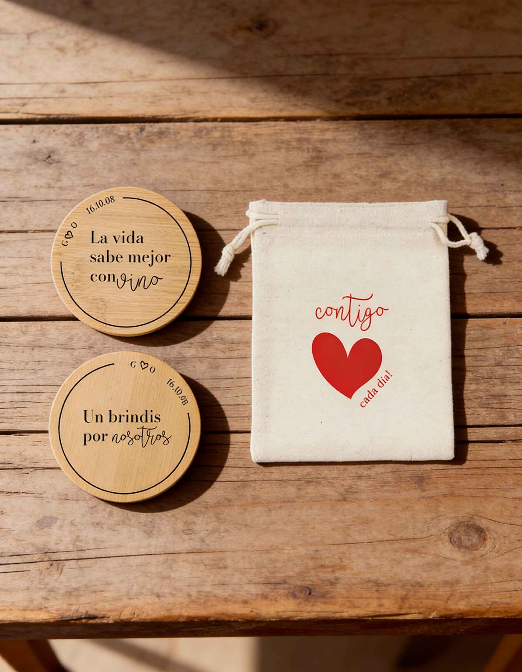 Este pack de 2 posavasos de bambú se personaliza con la frase que tú elijas, convirtiéndolo en un regalo único y especial.