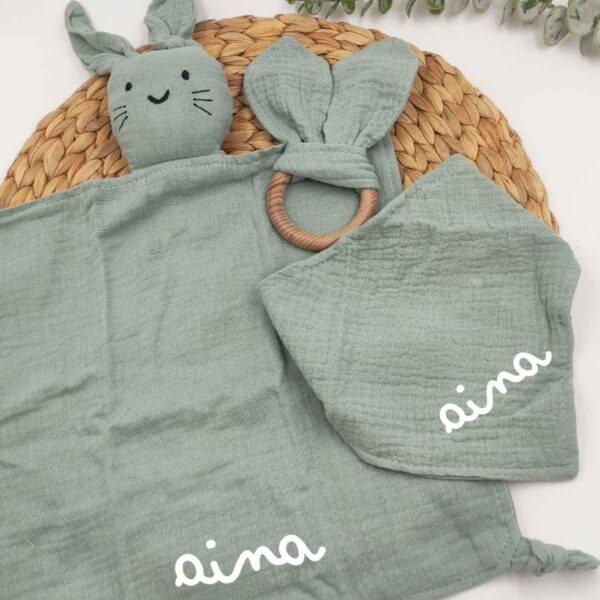 - Muñeco de Conejo de Muselina: Un adorable conejito de muselina, suave y seguro para abrazar y jugar, ideal para acompañar a tu pequeño en sus momentos de descanso.