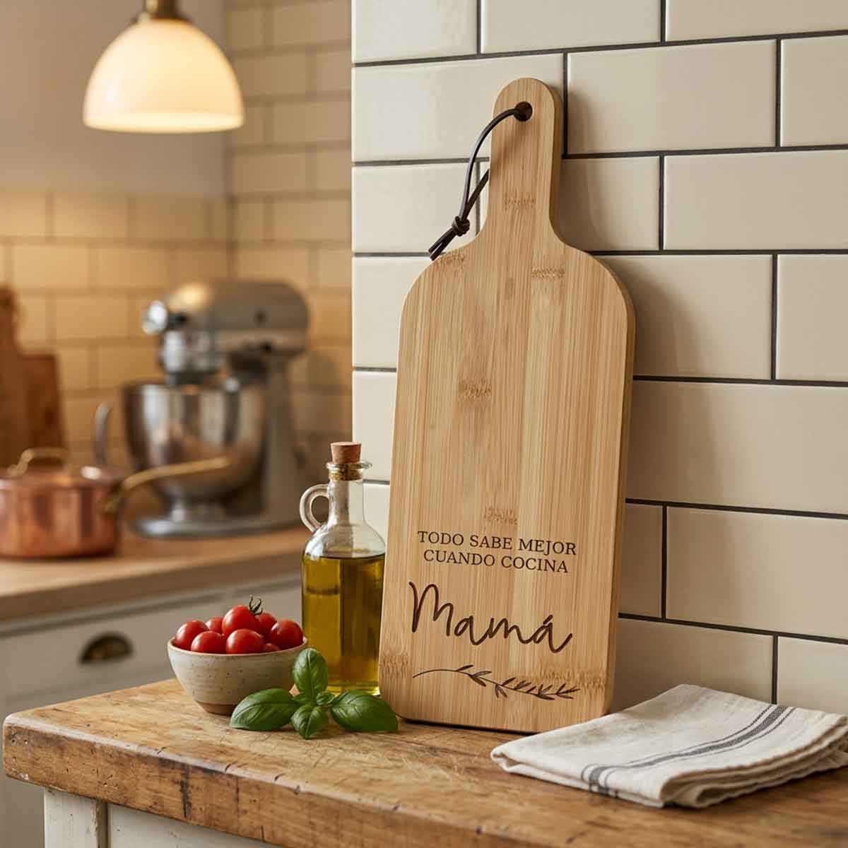 Si tu madre es una auténtica súper chef, este detalle le va a encantar. Una tabla de bambú práctica, resistente y con un diseño natural que la convertirá en su aliada favorita en la cocina.