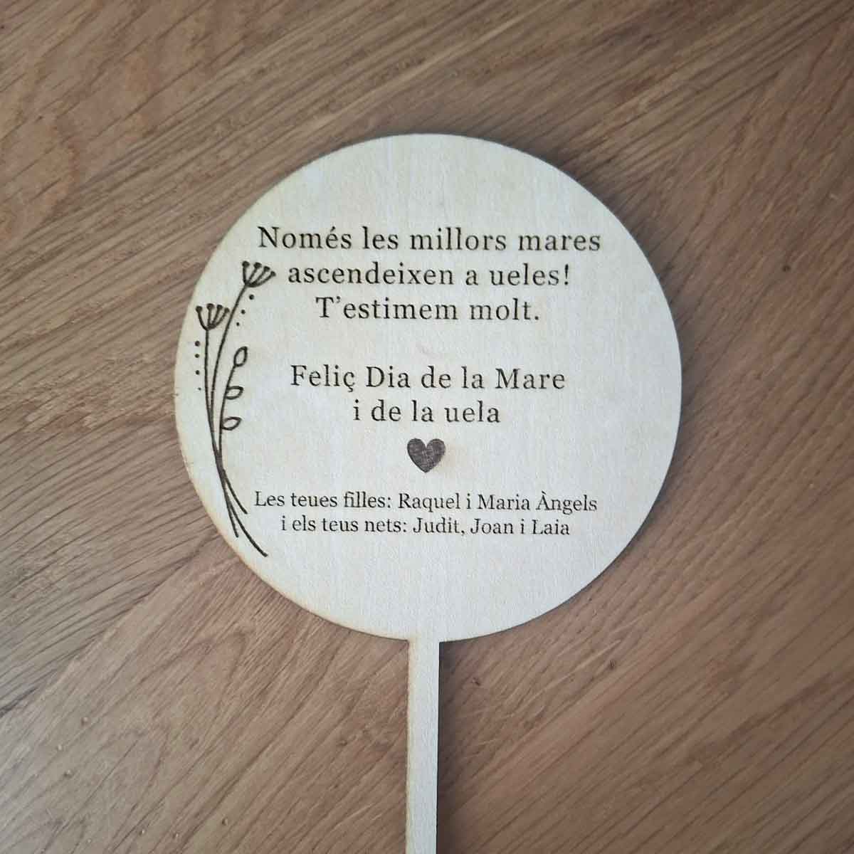 Sorprende con un detalle único y lleno de significado con el topper de madera personalizado para el Día de la Madre. Un complemento perfecto para ramos de flores, plantas o cualquier regalo especial, que añadirá un toque emotivo y totalmente personalizado.